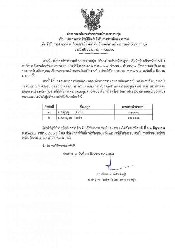 ประกาศรายชื่อผู้มีสิทธิ์เข้ารับการประเมินสมรรถนะ เพื่อเข้ารับการสรรหาและเลือกสรรเป็นพนักงานจ้างองค์การบริหารส่วนตำบลเขากระปุก ประจำปีงบประมาณ พ.ศ. 2568