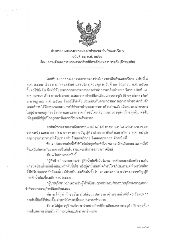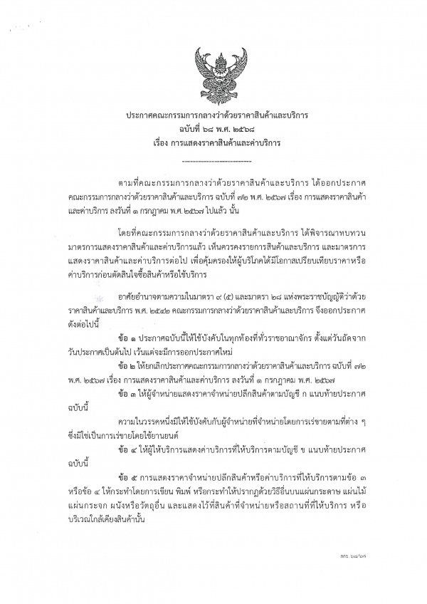 ด้วยคณะกรรมการกลางว่าด้วยราคาสินค้าและบริการ ได้ออกประกาศคณะกรรมการราคากลางว่าด้วยราคาสินค้าและบริการ เพื่อคุ้มครองให้ผู้บริโภคได้มีโอกาศเปรียบเทียบราคาหรือค่าบริการก่อนตัดสินใจซื้อสินค้าหรือใช้บริการ