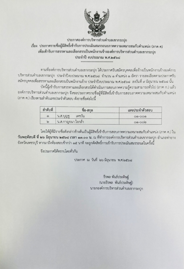 ประกาศรายชื่อผู้มีสิทธิ์เข้ารับการประเมินสมรรถนะภาคความเหมาะสมกับตำแหน่ง (ภาค ค ) เพื่อเข้ารับการสรรหาและเลือกสรรเป็นพนักงานจ้างองค์การบริหารส่วนตำบลเขากระปุก ประจำปี งบประมาณ พ.ศ. 2568