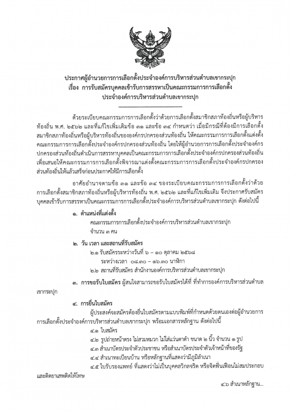 เรื่อง การรับสมัครบุคคลเข้ารับการสรรหาเป็นคณะกรรมการการเลือกตั้งประจำองค์การบรอหารส่วนตำบลเขากระปุก