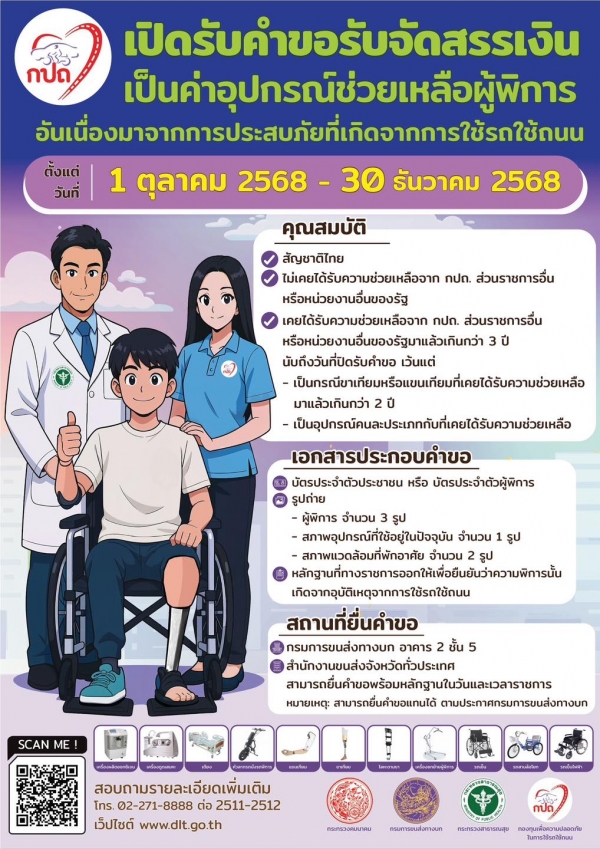 กองทุนเพื่อความปลอดภัยในการใช้รถใช้ถนน (กปถ.) เปิดรับคำขอรับจัดสรรเงินเป็นค่าอุปกรณ์ช่วยเหลือผู้พิการอันเนื่องมาจากการประสบภัยที่เกิดจากการใช้รถใช้ถนน