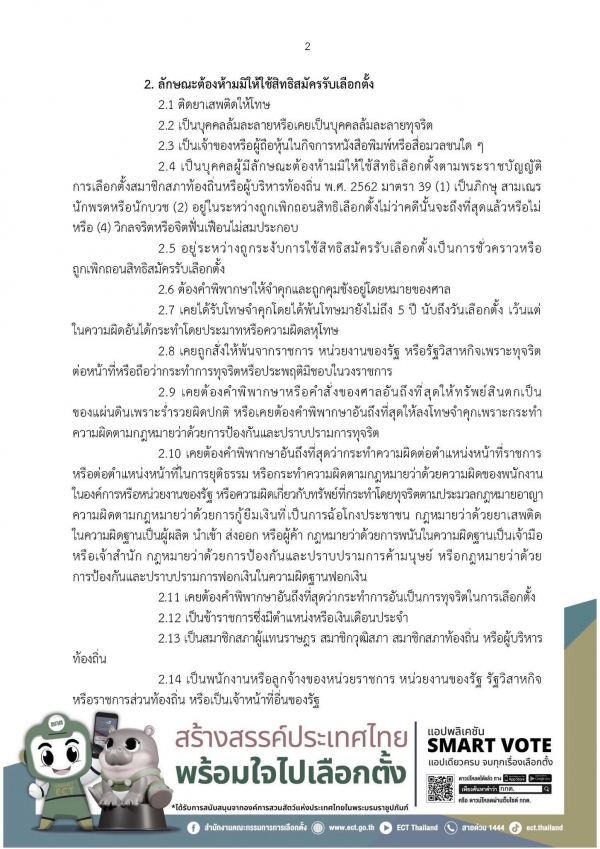 2.21 เป็นผู้สมัครรับเลือกตั้งเป็นสมาชิกสภาผู้แทนราษฎรหรือรับเลือกเป็นสมาชิกวุฒิสภา หรือเป็นผู้สมัครรับเลือกตั้งเป็นสมาชิกสภาท้องถิ่นหรือผู้บริหารท้องถิ่นขององค์กรปกครองส่วนท้องถิ่นเดียวกันหรือองค์กรปกครองส่วนท้องถิ่นอื่น